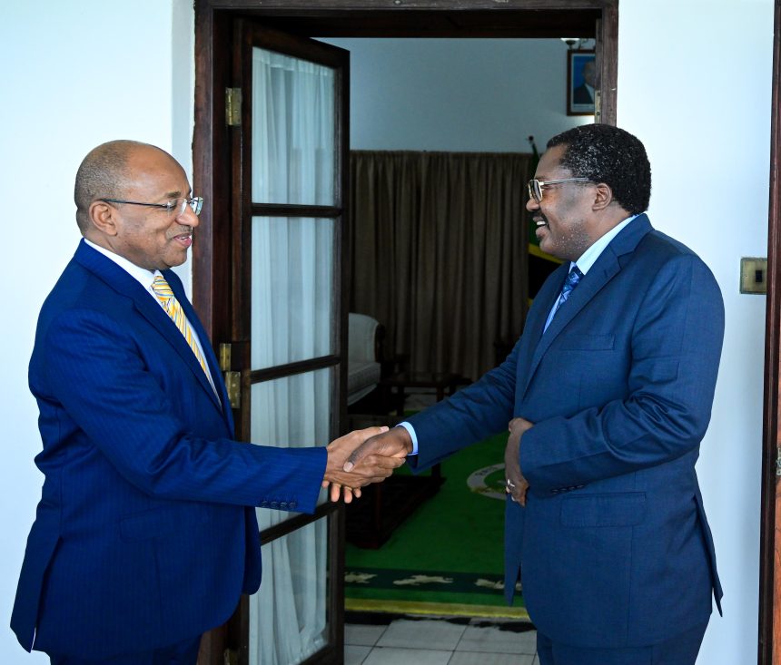 Makamu wa Rais wa Jamhuri ya Muungano wa Tanzania, Balozi Dkt. Emmanuel Nchimbi akisalimiana na Rais wa Zanzibar na Mwenyekiti wa Baraza la Mapinduzi Mhe. Dkt. Hussein Ali Mwinyi, wakati alipowasili Ikulu, Zanzibar leo tarehe 22 Novemba 2025.