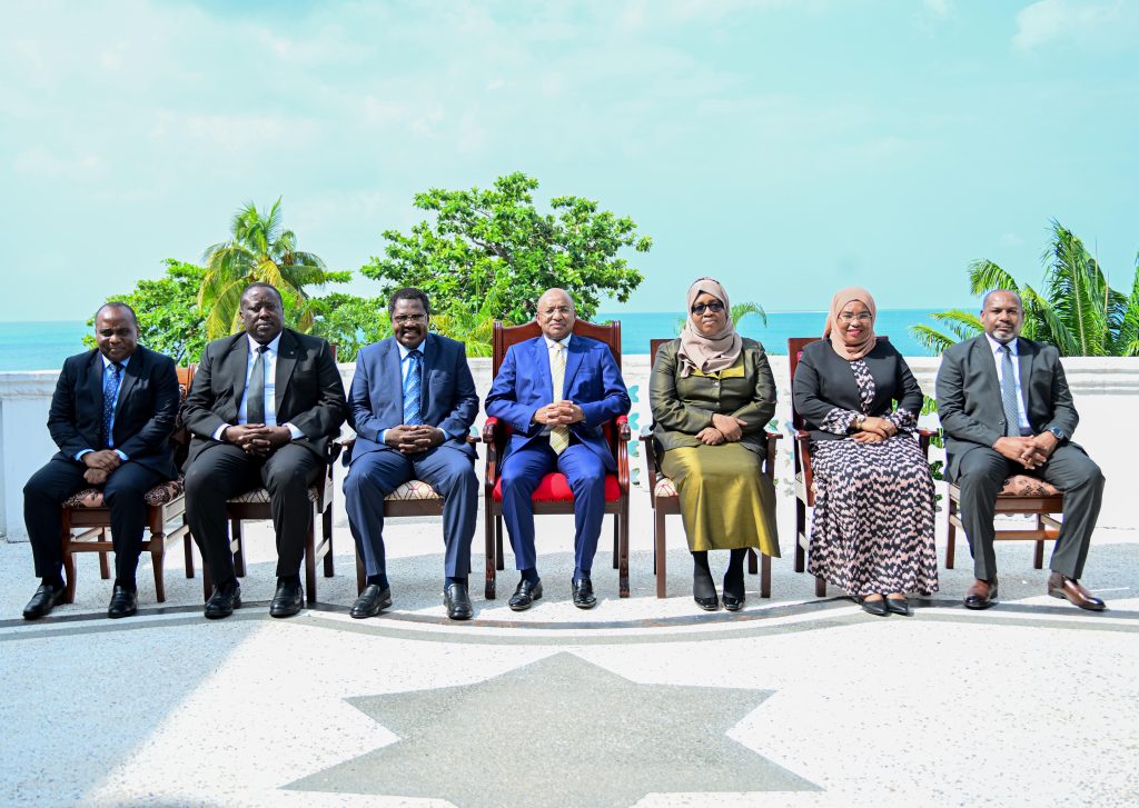 Makamu wa Rais wa Jamhuri ya Muungano wa Tanzania Mhe.Balozi Dkt. Emmanuel Nchimbi akiwa na Rais wa Zanzibar na Mwenyekiti wa Baraza la Mapinduzi Mhe. Dkt. Hussein Ali Mwinyi, katika picha ya pamoja na Viongozi mbalimbali, mara baada ya mazungumzo yaliyofanyika Ikulu, Zanzibar leo tarehe 22 Novemba 2025. (kutoka kulia ni Katibu Mkuu Ofisi ya Rais Zanzibar Salehe Juma Mussa, Waziri wa Nchi Ofisi ya Rais Zanzibar Dkt. Saada Mkuya, Katibu wa Baraza la Mapinduzi na Katibu Mkuu Kiongozi, Zanzibar Mhandisi Zena Said, Katibu Mkuu wa Ofisi ya Makamu wa Rais (Muungano na Mazingira) Mhandisi Cyprian Luhemeja na Katibu wa Makamu wa Rais Bw. Edwin Makamba)